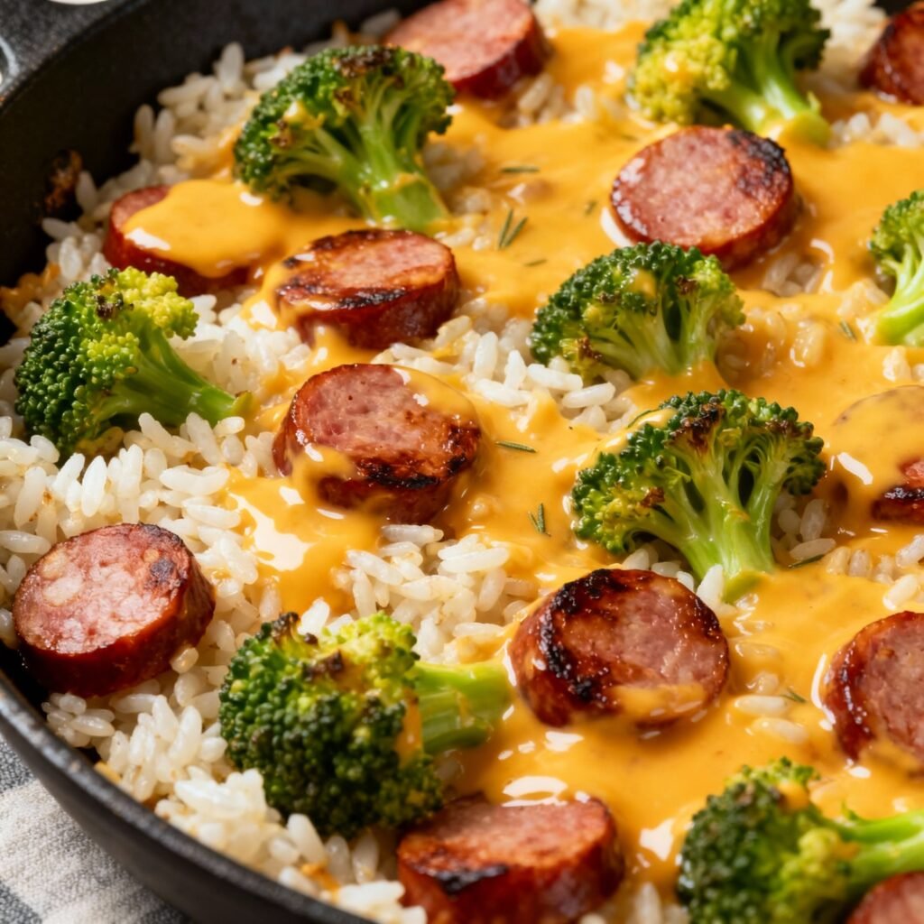 Cheesy Kielbasa Rice and Broccoli Skillet