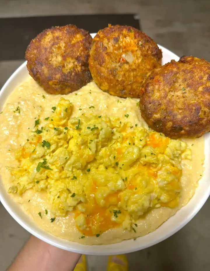 Salmon Patties, Cheesy Eggs and Cheesy Grits Recipe