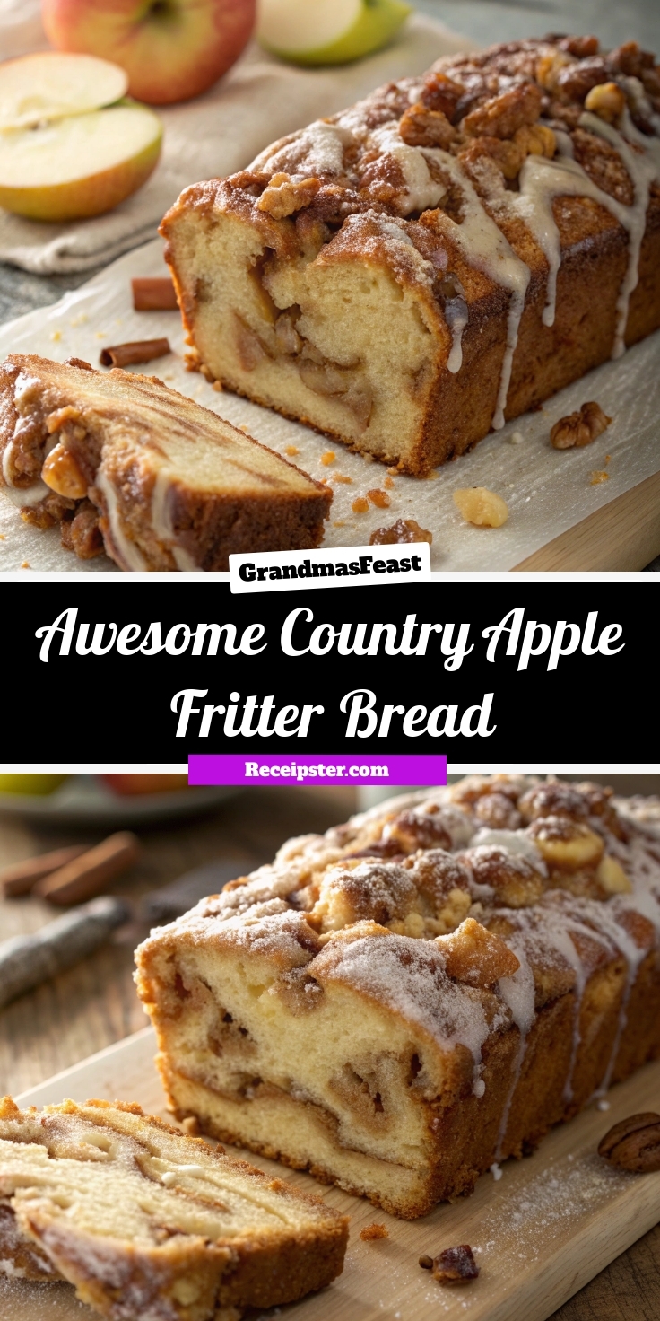 Awesome Country Apple Fritter Bread greets you with an intoxicatingly warm and fragrant aroma because cinnamon and brown sugar caramelize beautifully in the oven. Each slice offers a delightful contrast in textures, featuring an incredibly moist and tender crumb that practically melts in your mouth. Meanwhile, the generous chunks of apple provide a soft, almost creamy burst of fruitiness in every single bite. The true masterpiece, however, is the irresistible cinnamon-sugar swirl that weaves through the loaf, creating pockets of sweet, chewy goodness. A final crowning glory comes from the crisp, crackly glaze on top, which adds a satisfying sugary texture that complements the soft interior perfectly. You will absolutely love the rich, buttery notes from the batter because they perfectly balance the tartness of the fresh apples. Ultimately, this Awesome Country Apple Fritter Bread delivers a comforting and cozy experience with its harmonious blend of sweet and spiced flavors, making it an unforgettable treat.