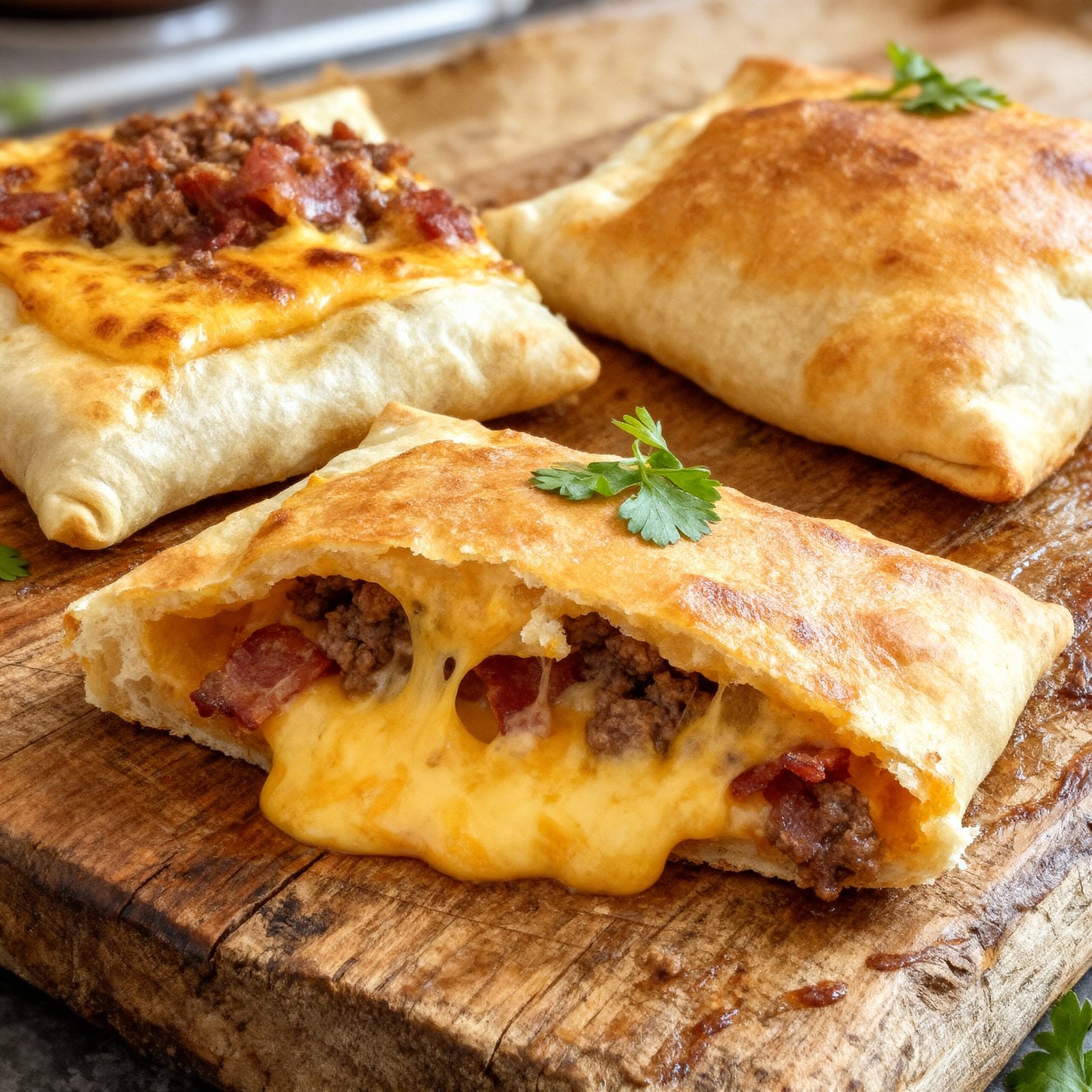 These savory pockets combine the smoky richness of bacon with juicy ground beef and melted cheddar, all wrapped in golden pizza crust for the ultimate handheld comfort food.