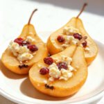 A cozy and elegant baked pear dish combining the sweetness of honey, tartness of cranberries, and the salty creaminess of feta cheese, perfect for a fall or winter dessert or appetizer.
