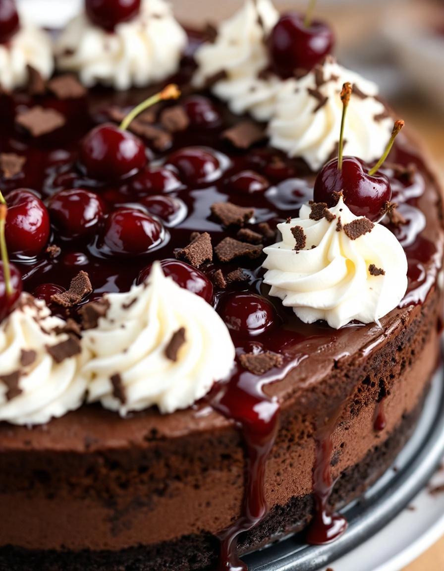 A decadent cheesecake combining the rich flavors of chocolate and cherries, inspired by the classic Black Forest cake.