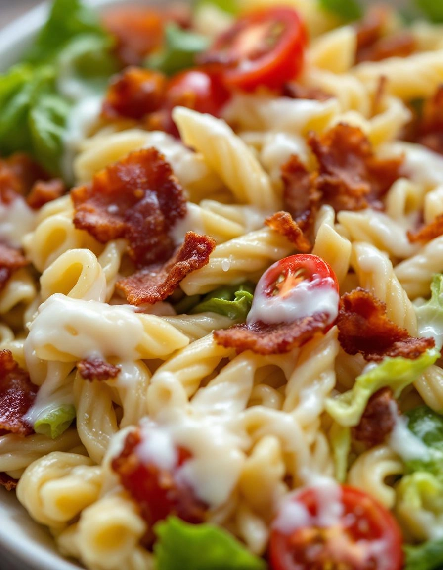 - Add cooled pasta, bacon, lettuce, and tomatoes to the bowl. Toss gently to coat everything in the dressing.