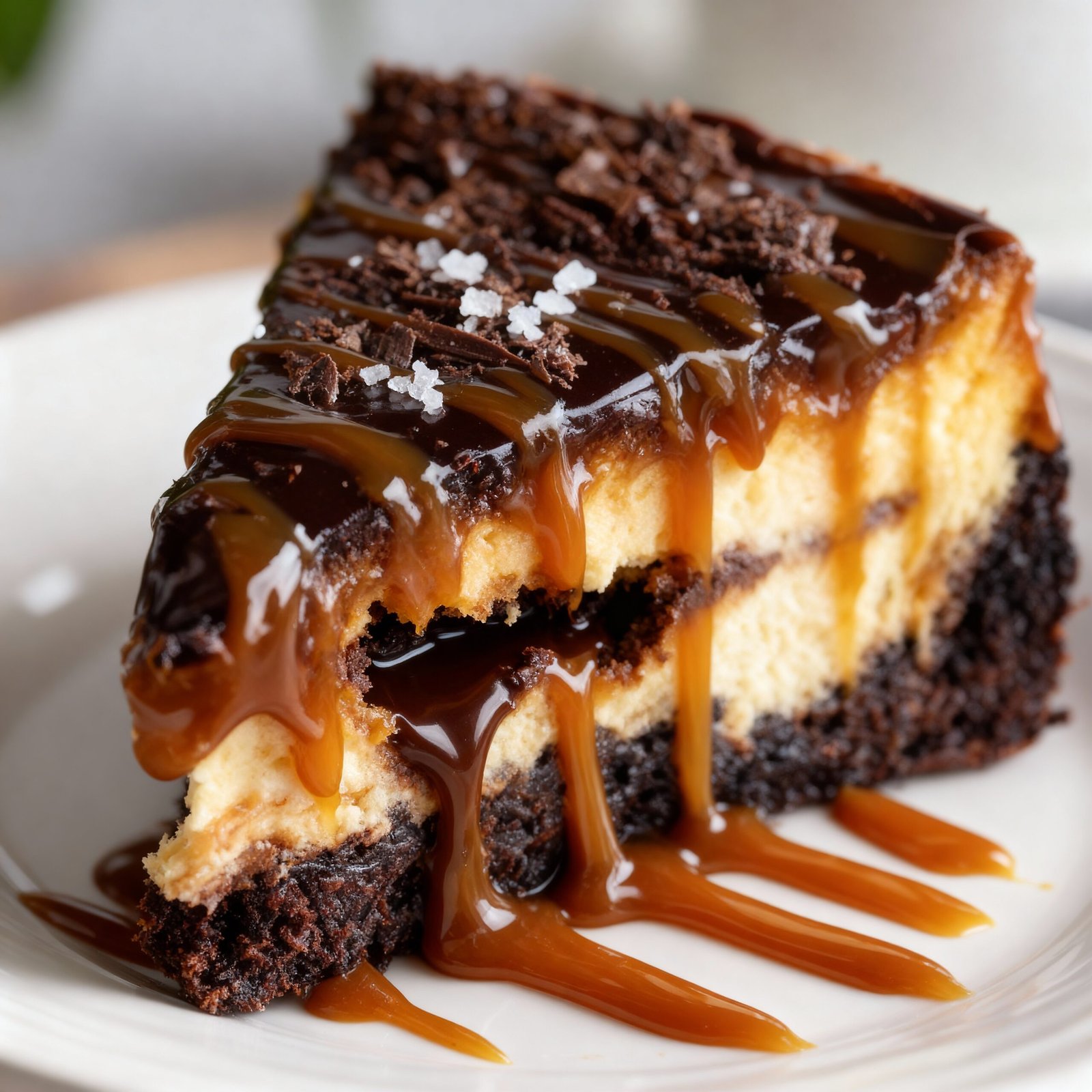 Decadent triple-layer dessert featuring a fudgy brownie base, creamy cheesecake layer, and a salted caramel drizzle, perfect as a show-stopping treat.