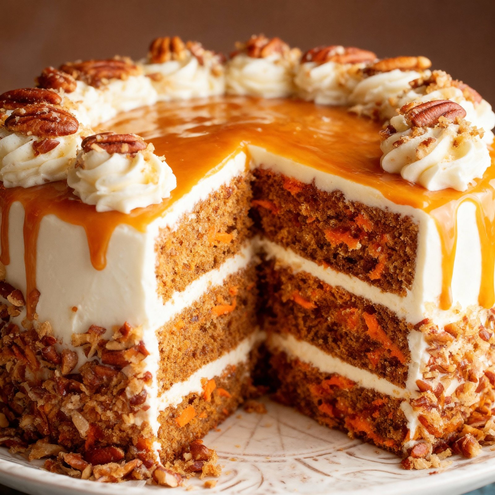 A moist and flavorful carrot cake loaded with shredded carrots and chopped pecans, finished with a rich cream cheese frosting.
