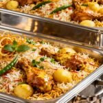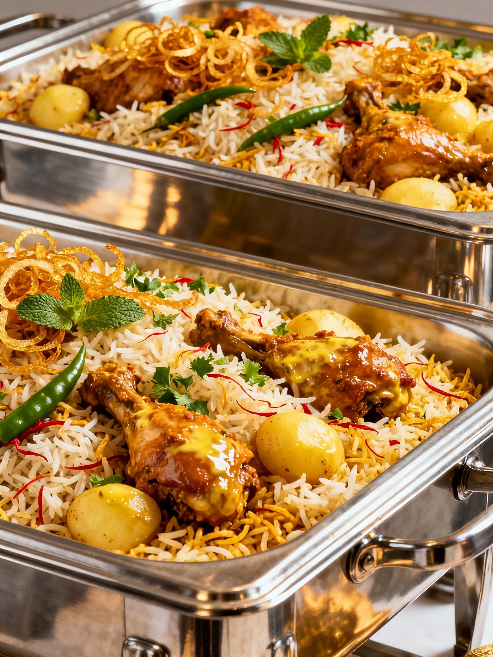 A large-batch, aromatic chicken biryani recipe designed for catering, featuring marinated chicken, fragrant basmati rice, and a blend of traditional spices for authentic flavor.