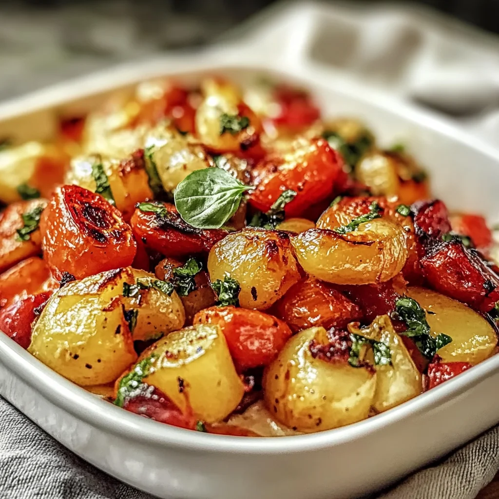 Add the roasted vegetable medley to the skillet with the creamy sauce. Gently toss until all the vegetables are evenly coated. Transfer everything to a serving dish and top with the freshly chopped basil. In my tests, adding the basil at the very end preserves its bright color and fresh flavor, making this dish truly irresistible.