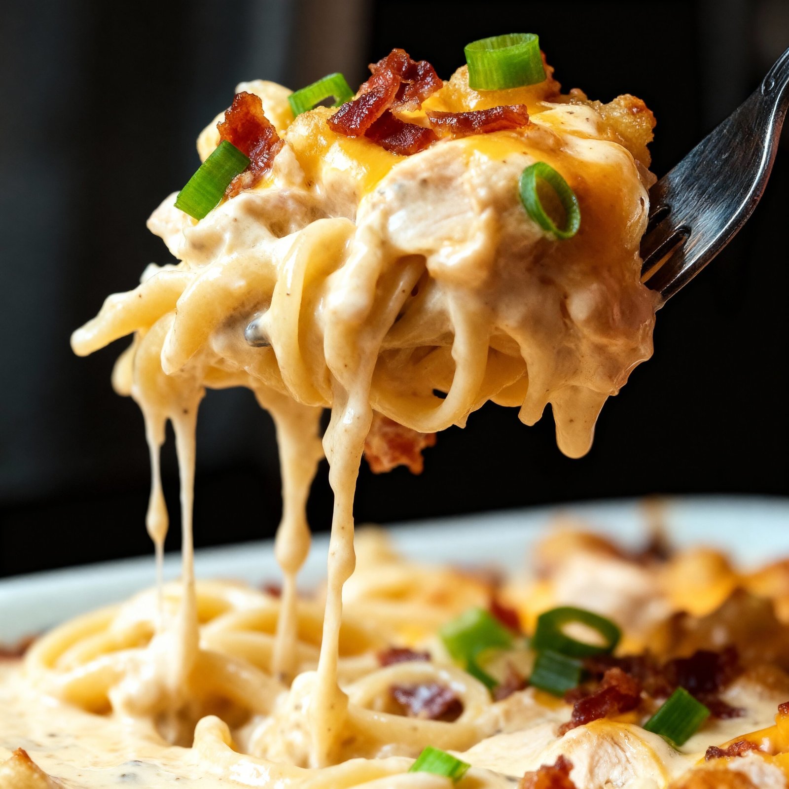 A creamy, cheesy casserole combining shredded chicken, cooked pasta, bacon, ranch dressing, sour cream, and a blend of cheeses, baked to a bubbly perfection and optionally garnished with green onions.