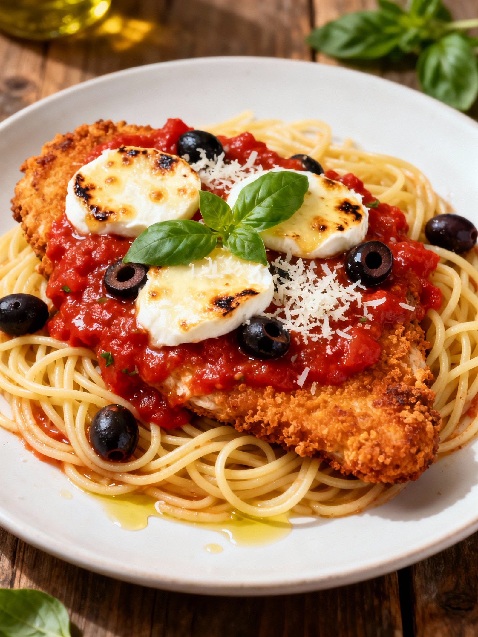 A classic Italian-American dish featuring breaded chicken breasts topped with tomato sauce, fresh mozzarella, and Parmesan cheese, served over spaghetti.
