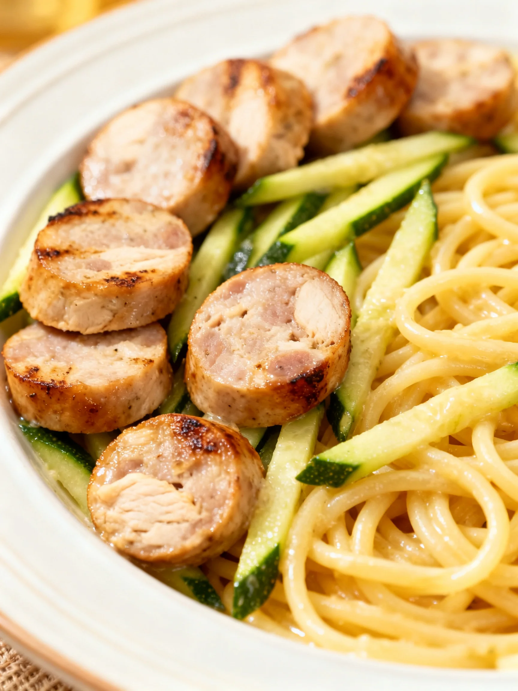 - Plate the restored Chicken Sausages Zucchini Pasta in shallow bowls with a generous swirl of basil chiffonade and a shaving of Parmesan curls on top for texture contrast.