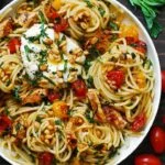 • Lower-Carb Option (Zucchini Noodles or Spaghetti Squash) — Swap traditional spaghetti for spiralized zucchini noodles (zoodles) or roasted spaghetti squash. This creates a lighter, vegetable-forward base that pairs perfectly with the creamy burrata and rich sauce.