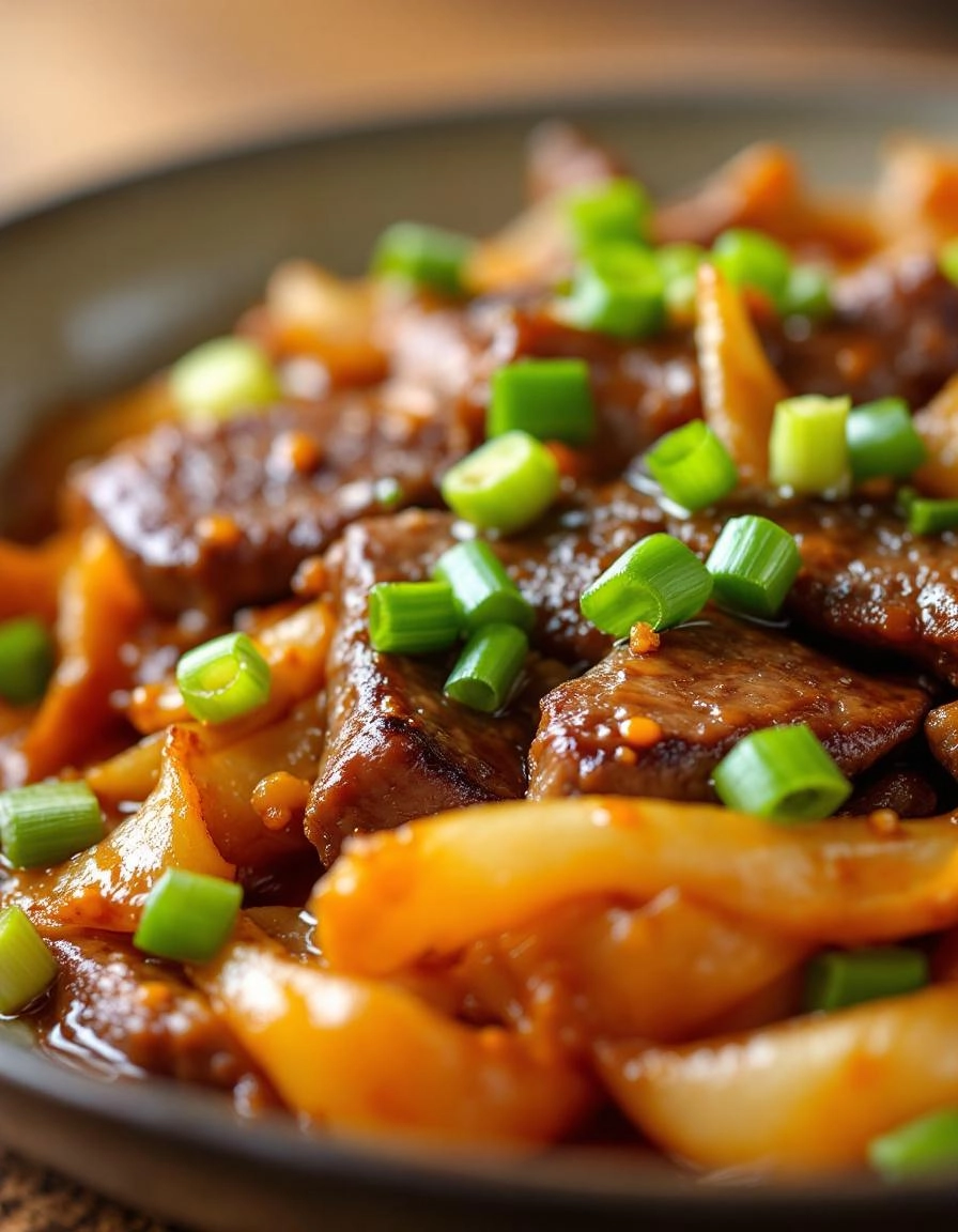 A quick and flavorful stir fry featuring tender beef and caramelized onions in a savory sauce.