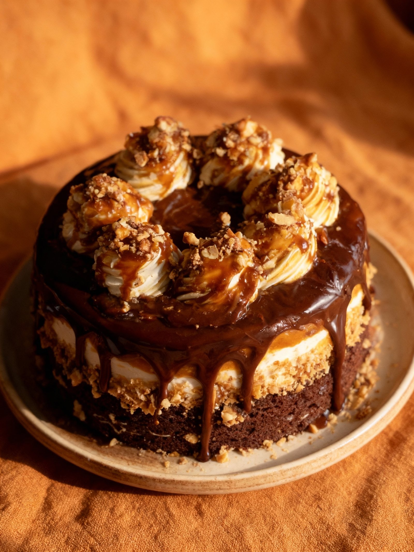 A decadent chocolate cake layered with caramel, toffee, and a crunchy pecan mixture, finished with a rich chocolate frosting and a toffee crunch garnish.