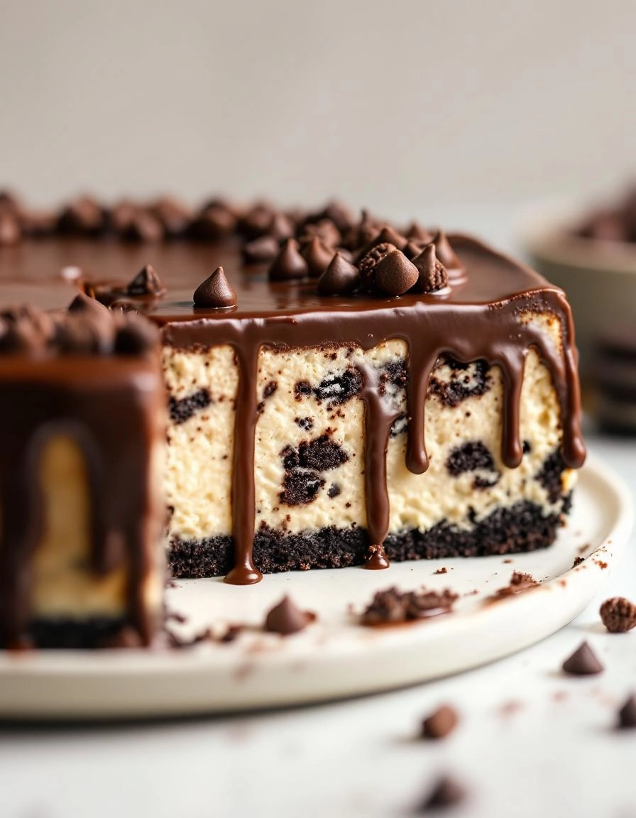 A rich and creamy chocolate chip cheesecake with a crunchy Oreo crust, topped with smooth chocolate ganache.