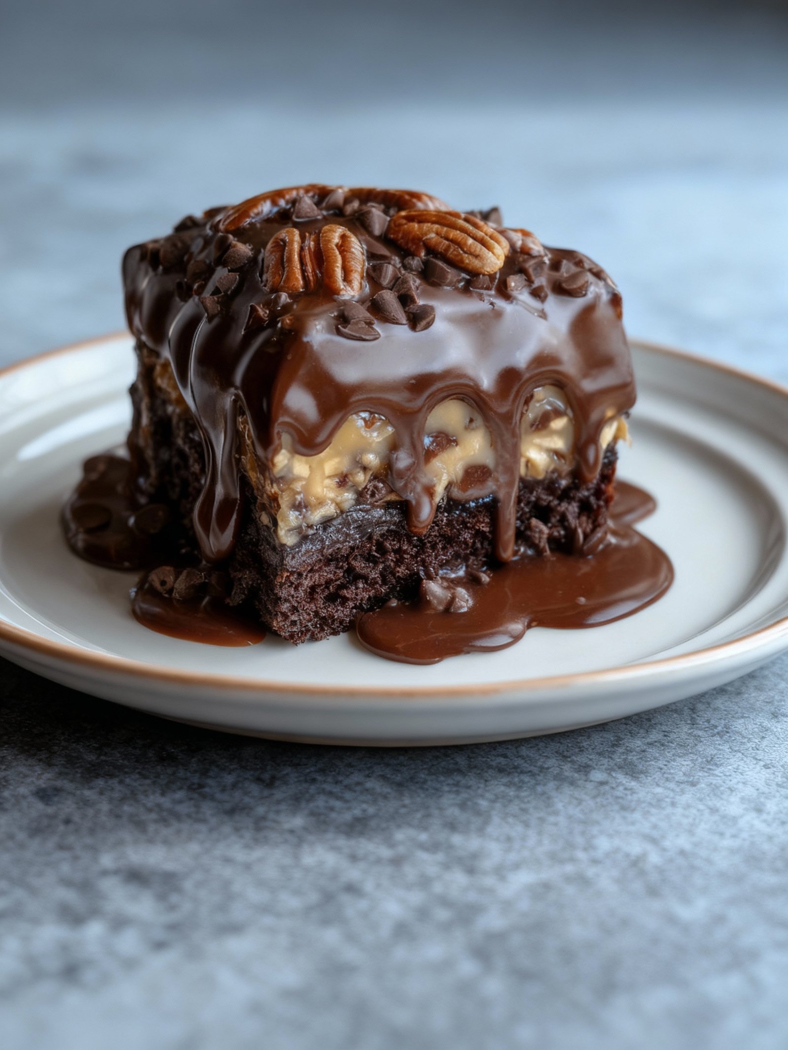 This decadent chocolate caramel pecan cake delivers rich, gooey layers with every bite, combining moist chocolate cake with sweet caramel and crunchy pecans for an irresistible dessert experience.