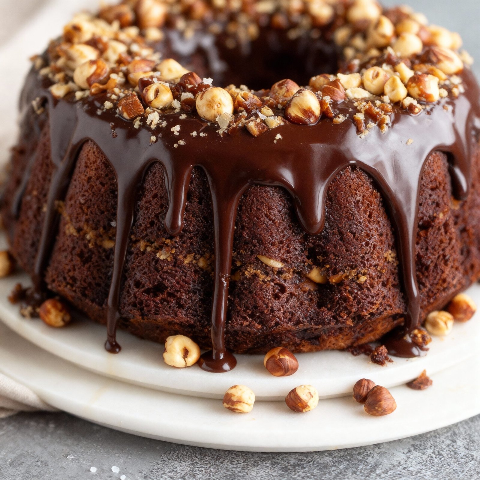 A rich and moist chocolate hazelnut cake shaped into a braided wreath, topped with chocolate ganache, toasted hazelnuts, and a sprinkle of sea salt, perfect for festive occasions.