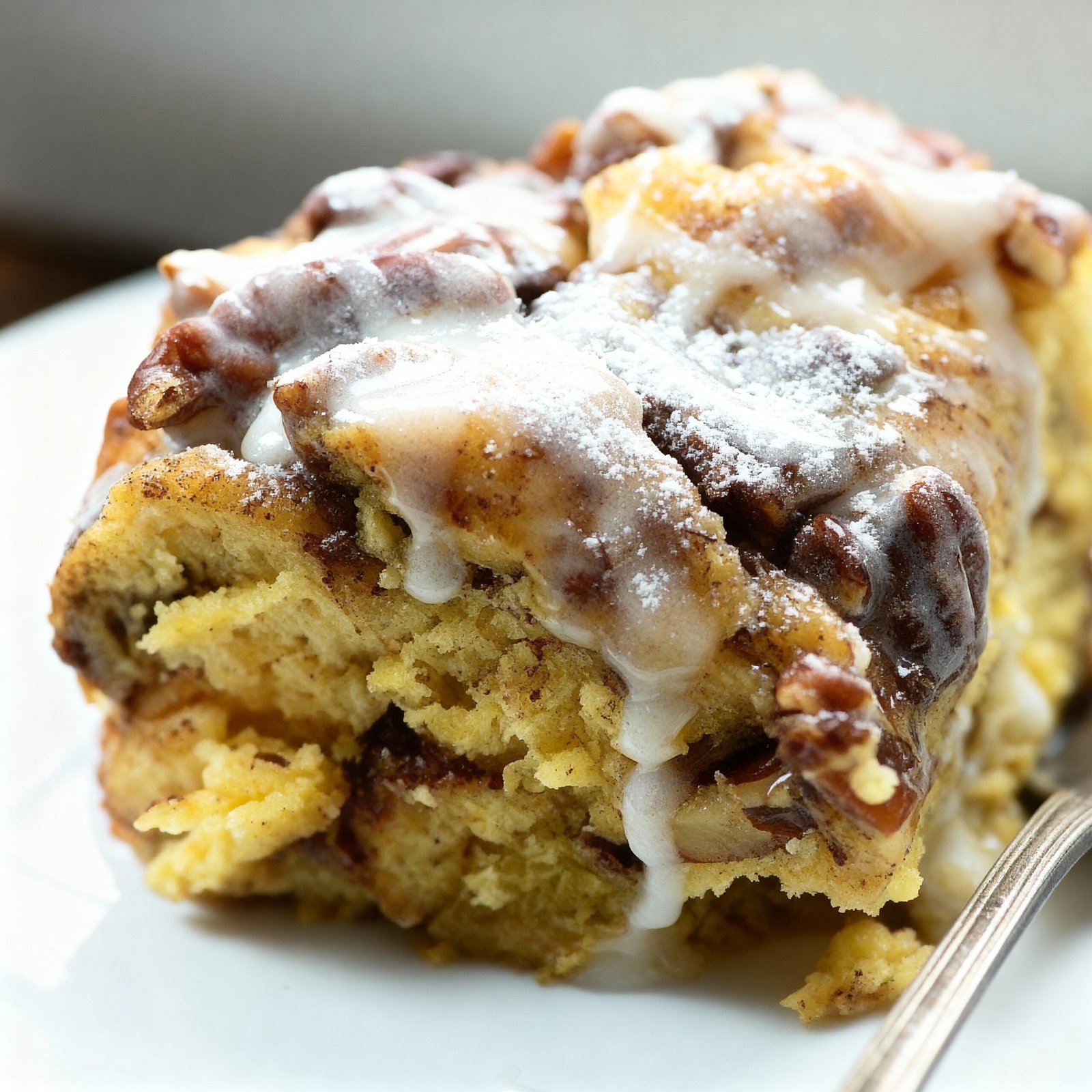 A decadent breakfast casserole combining the flavors of cinnamon rolls and French toast, baked with a rich custard and topped with a sweet glaze.