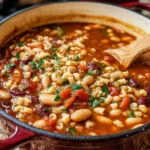 - Build the soup base: Stir in diced tomatoes, tomato sauce, beans, beef broth, and seasonings. Bring to a boil, then reduce heat and simmer uncovered for 20–25 minutes.