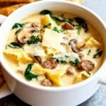 A hearty and creamy soup combining sausage, mushrooms, spinach, and broken lasagna noodles in a rich Parmesan cheese broth, perfect for cold winter months.