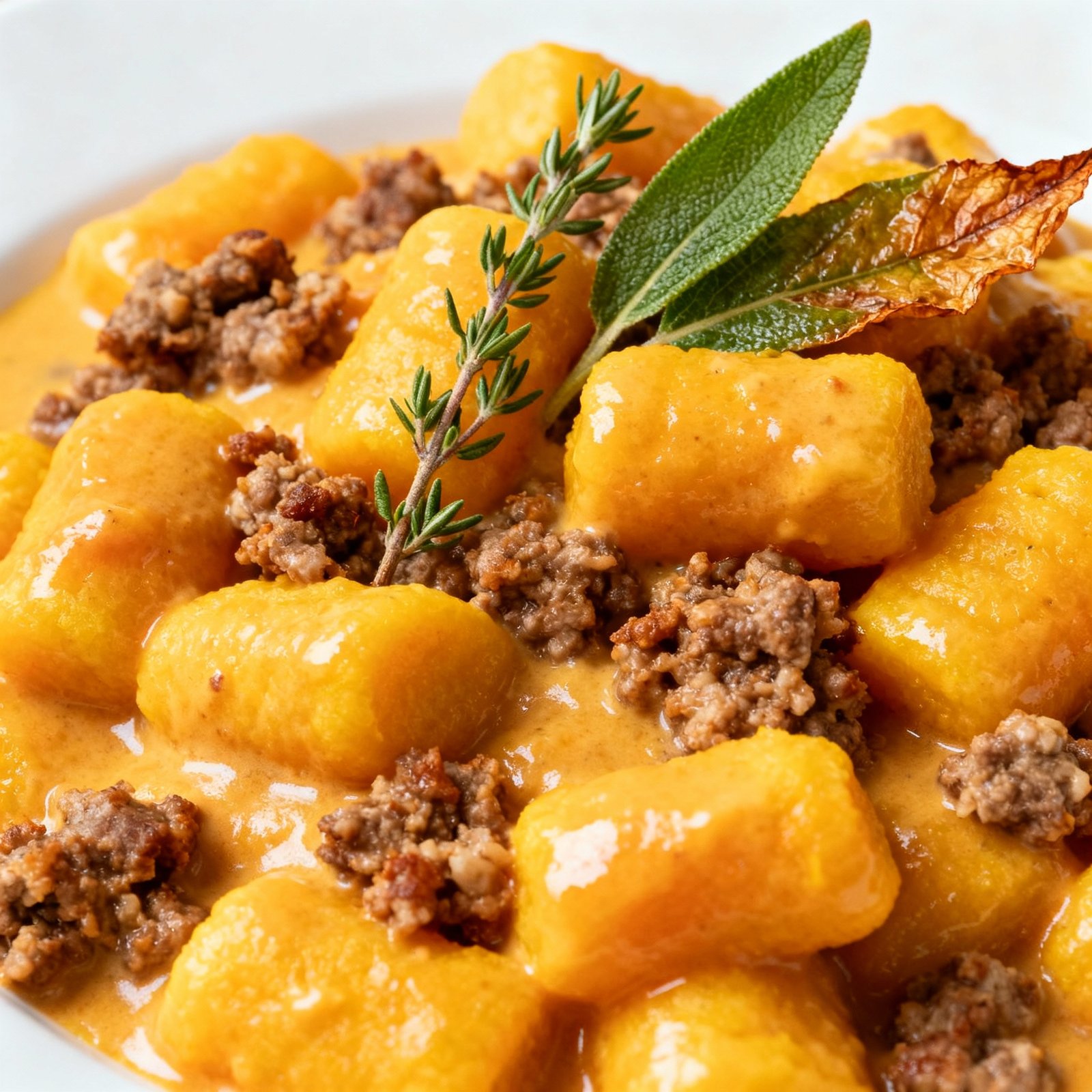 A cozy, flavorful one-pan dish featuring tender potato gnocchi, savory Italian sausage, and a rich, creamy butternut squash sauce infused with fresh sage, thyme, and garlic. Perfect for a comforting fall meal.