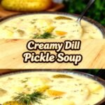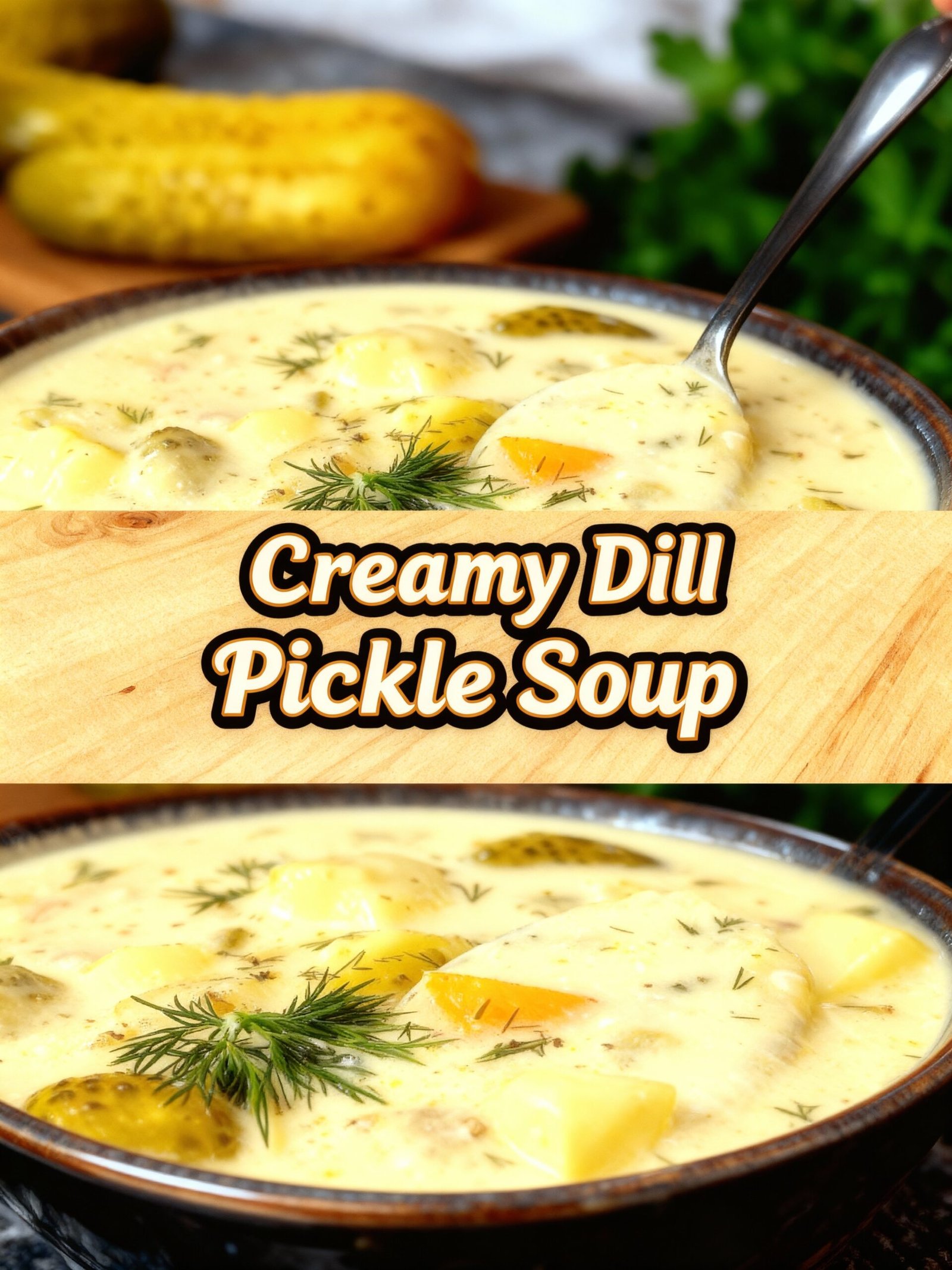 A tangy and creamy soup featuring the bright flavor of dill pickles, perfect as a comforting appetizer or light meal.