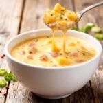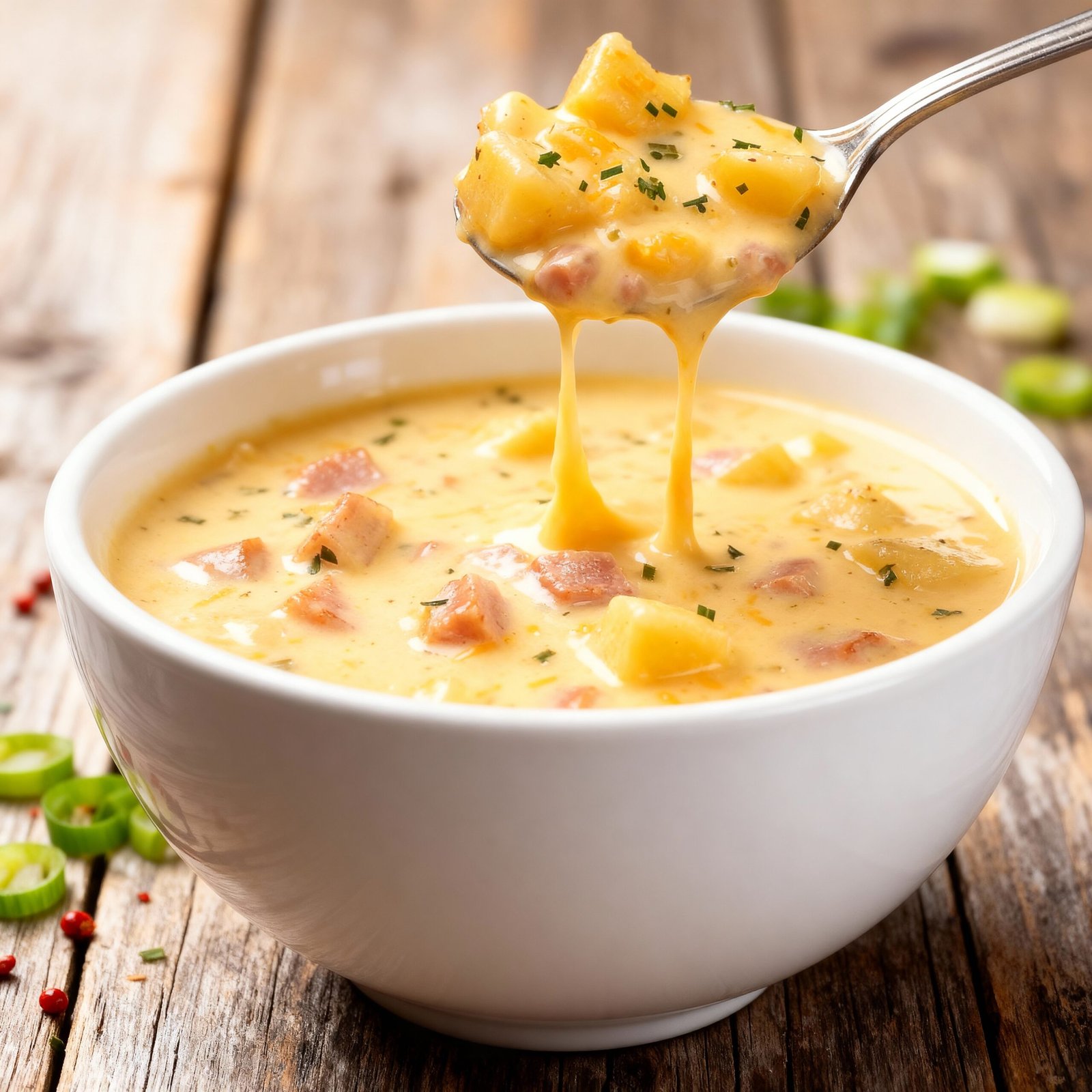 A creamy, comforting soup featuring tender potatoes, diced ham, and vegetables in a rich dairy-based broth, topped with melted cheddar cheese.