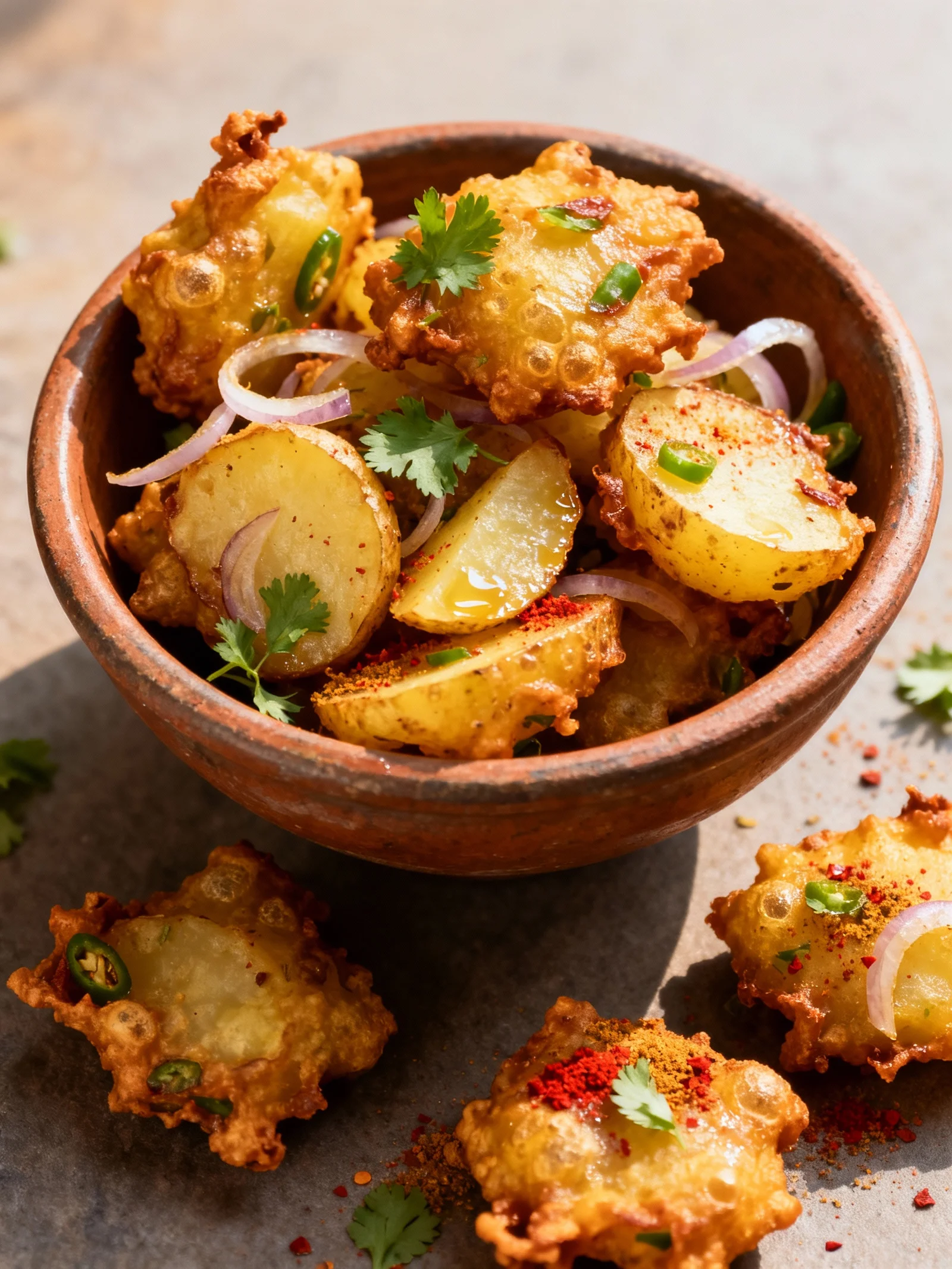 Crispy and flavorful Indian-style potato and onion fritters made with a spiced gram flour batter, perfect as a snack or appetizer served with chutney.