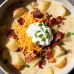 A rich and hearty baked potato soup with smoky bacon, green onions, cheddar cheese, and a creamy base, perfect for lunch or dinner.
