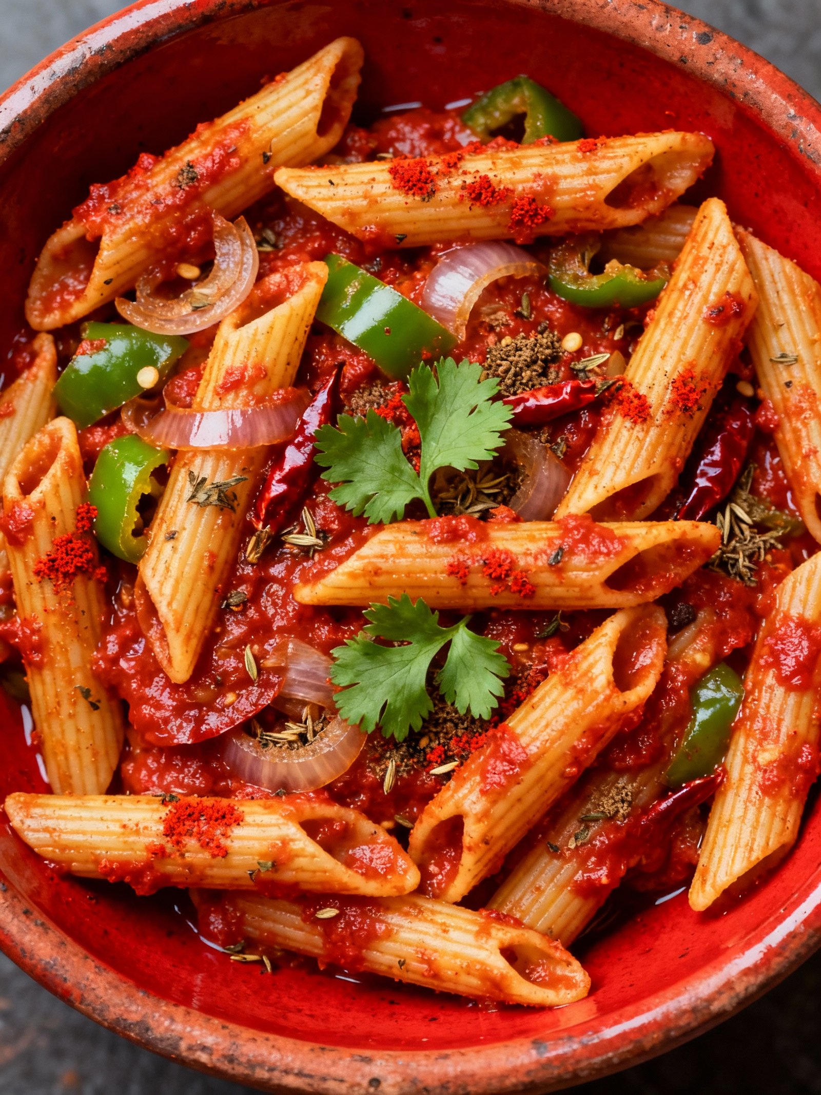 A flavorful Indian-inspired version of classic Italian red sauce pasta, combining rich tomato sauce with spices tailored for the desi palate, perfect for a quick, comforting meal.