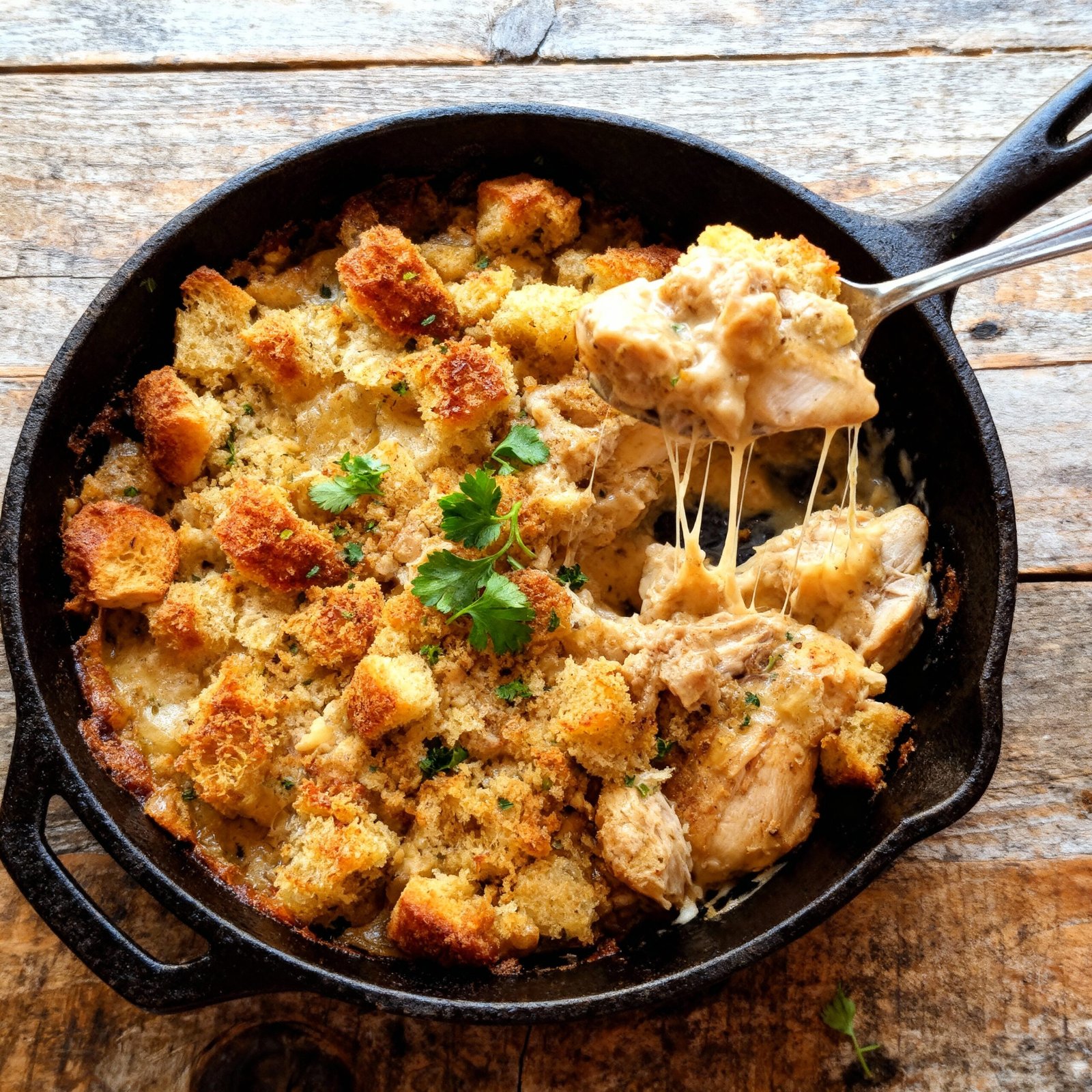 A comforting casserole combining shredded chicken, creamy soup, and a buttery stuffing topping, baked to golden perfection with a crispy crust and creamy interior.