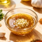In a medium bowl, whisk together the olive oil and fresh lemon juice until emulsified. Smash the garlic cloves with the flat side of your knife to release their oils, then mince finely. (Pro tip: Smashing before mincing creates a more potent garlic paste that distributes flavor evenly). Whisk the garlic and honey into the oil and lemon mixture until fully incorporated.