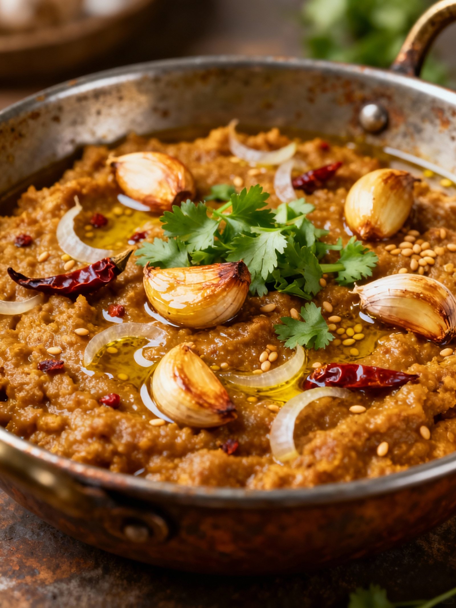 Taste and adjust seasoning. The Garlic Bharta should be intensely aromatic with a balance of smoky, spicy, and savory notes.