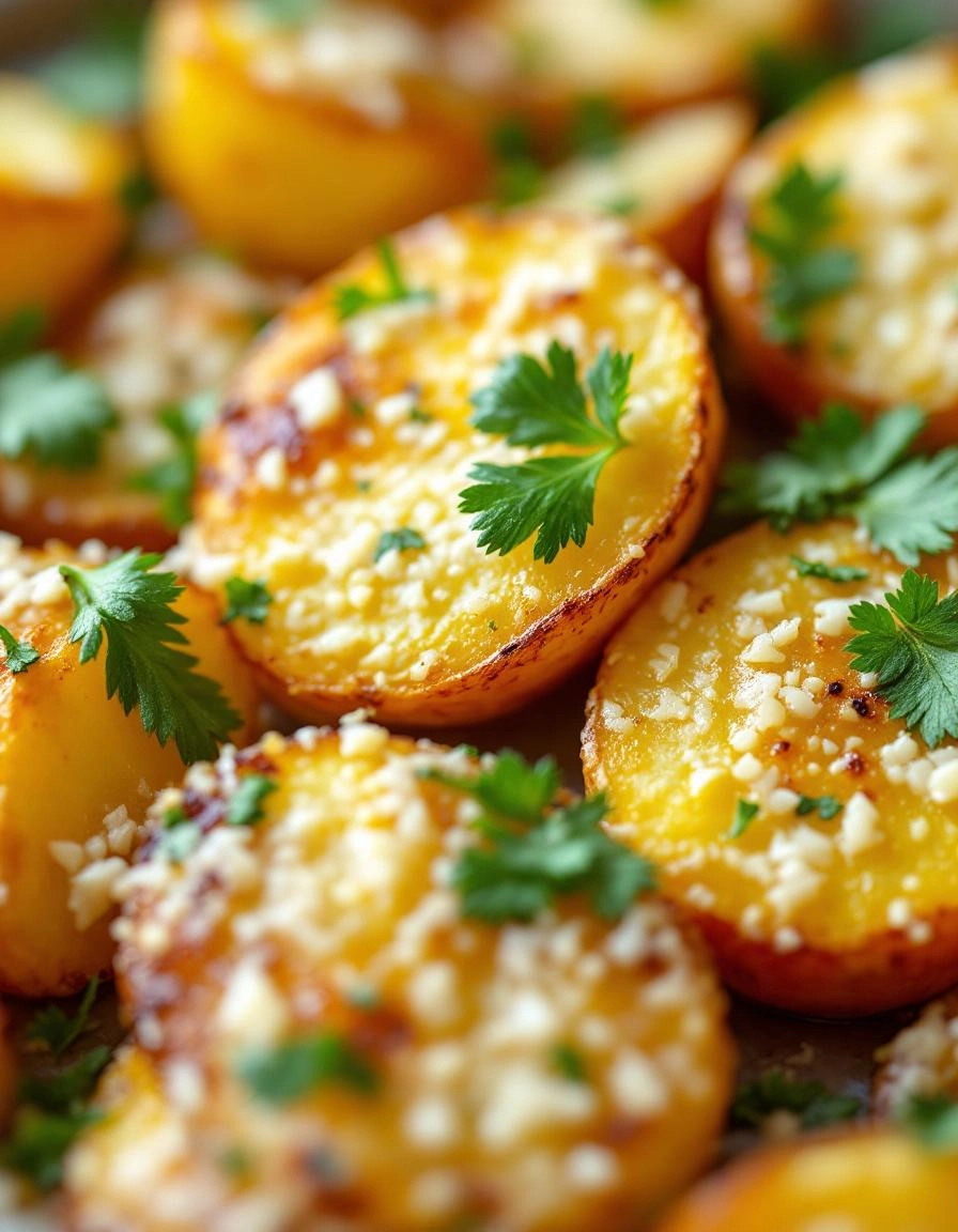 Crispy roasted potatoes tossed in garlic, parmesan, and herbs for a flavorful side dish.