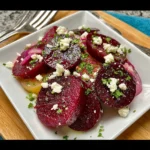 Transfer the marinated beet mixture to your serving platter or bowl. Crumble the feta cheese generously over the top. Drizzle with the remaining dressing and garnish with additional chopped fresh parsley, mint, and a sprinkle of dried oregano. For the best texture, add the feta just before serving to keep it from dissolving into the dressing.