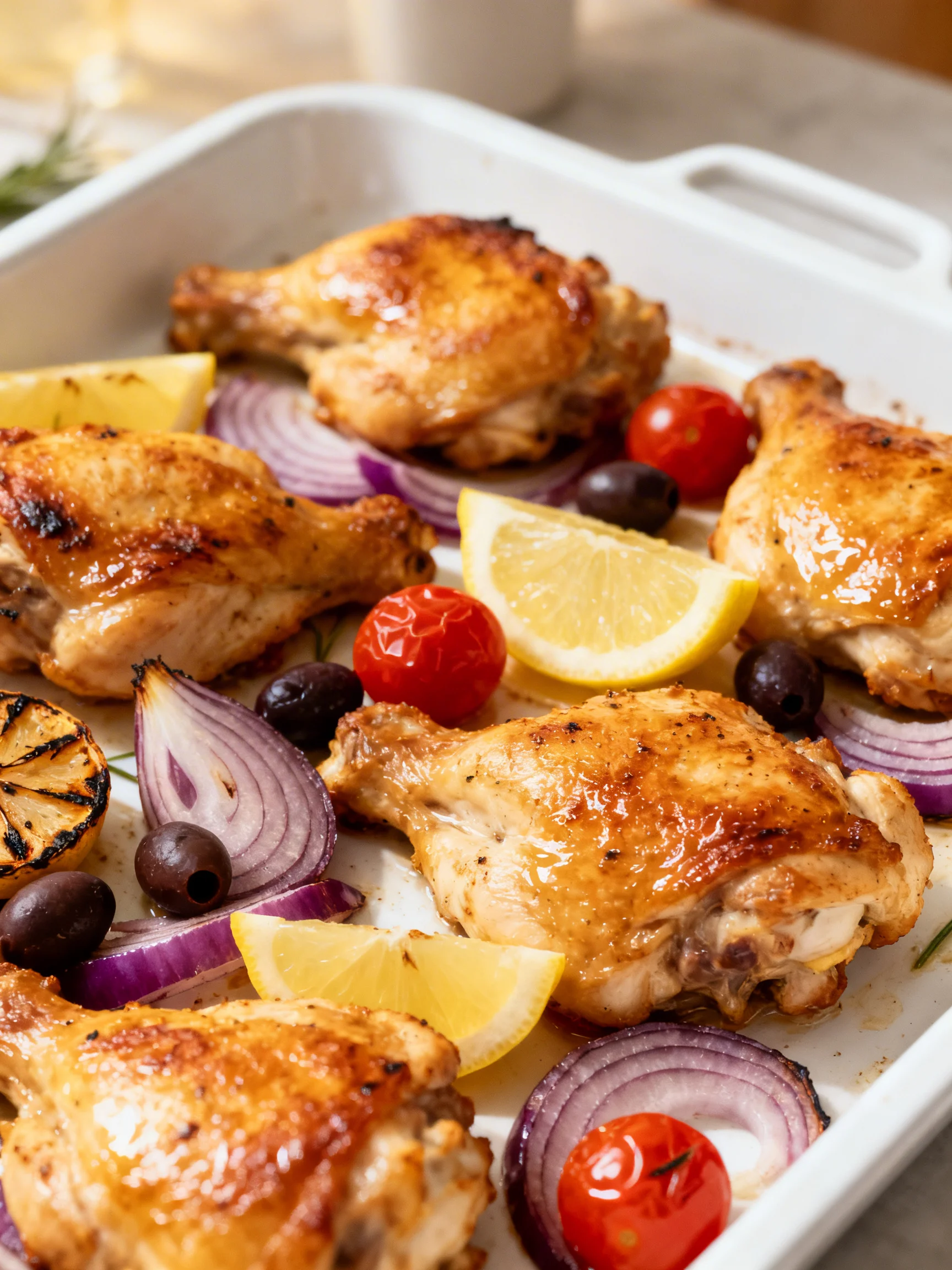 This Greek chicken dinner is a high-protein, nutrient-dense meal, providing a good source of Vitamin C from the bell peppers and tomatoes, and iron from the chicken. Note: Estimates are based on typical ingredients and a serving size of one chicken thigh with vegetables. Values may vary with specific brands or ingredient swaps.
