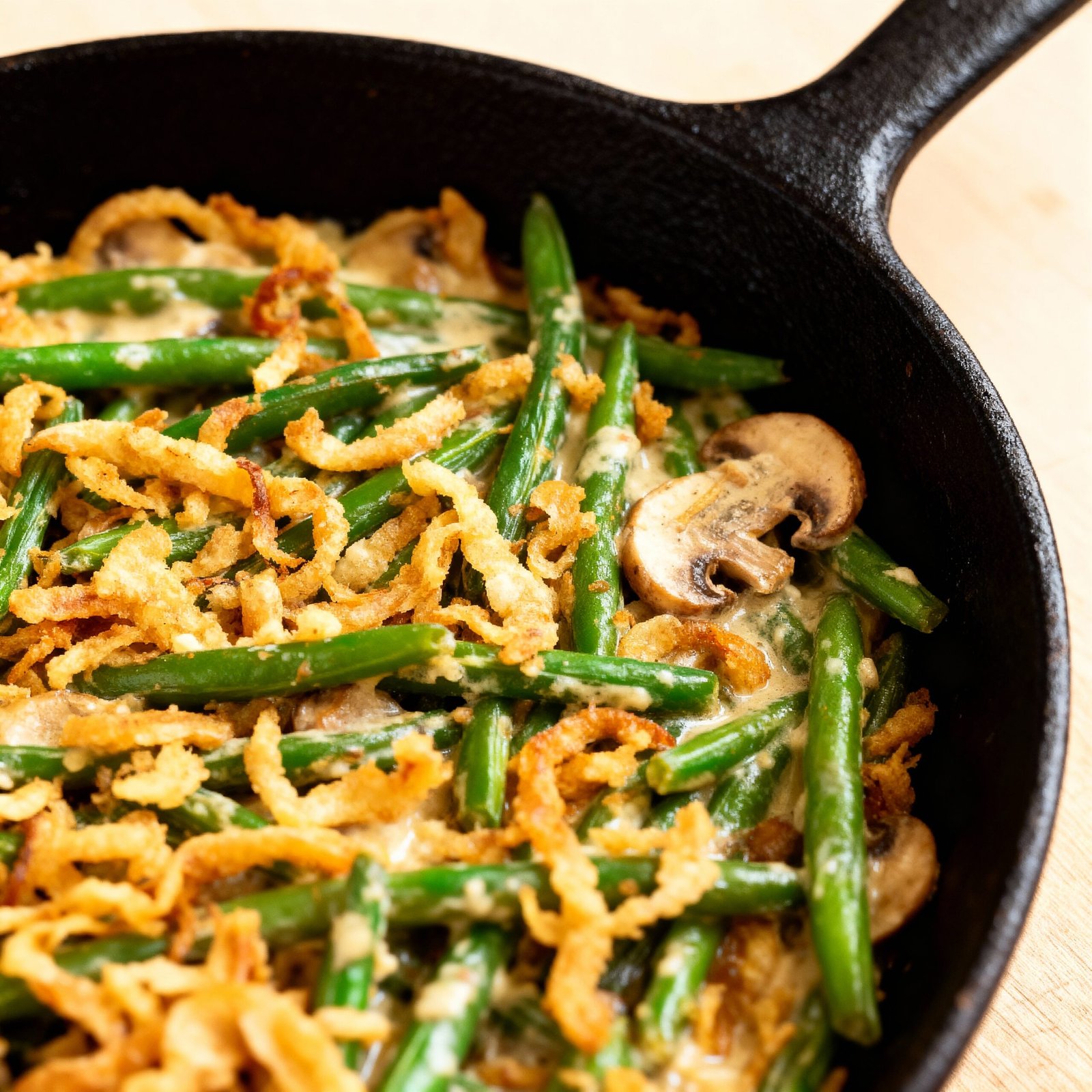 A classic holiday side dish featuring tender green beans in a creamy mushroom sauce, topped with crispy fried onions for a perfect balance of creamy and crunchy textures.