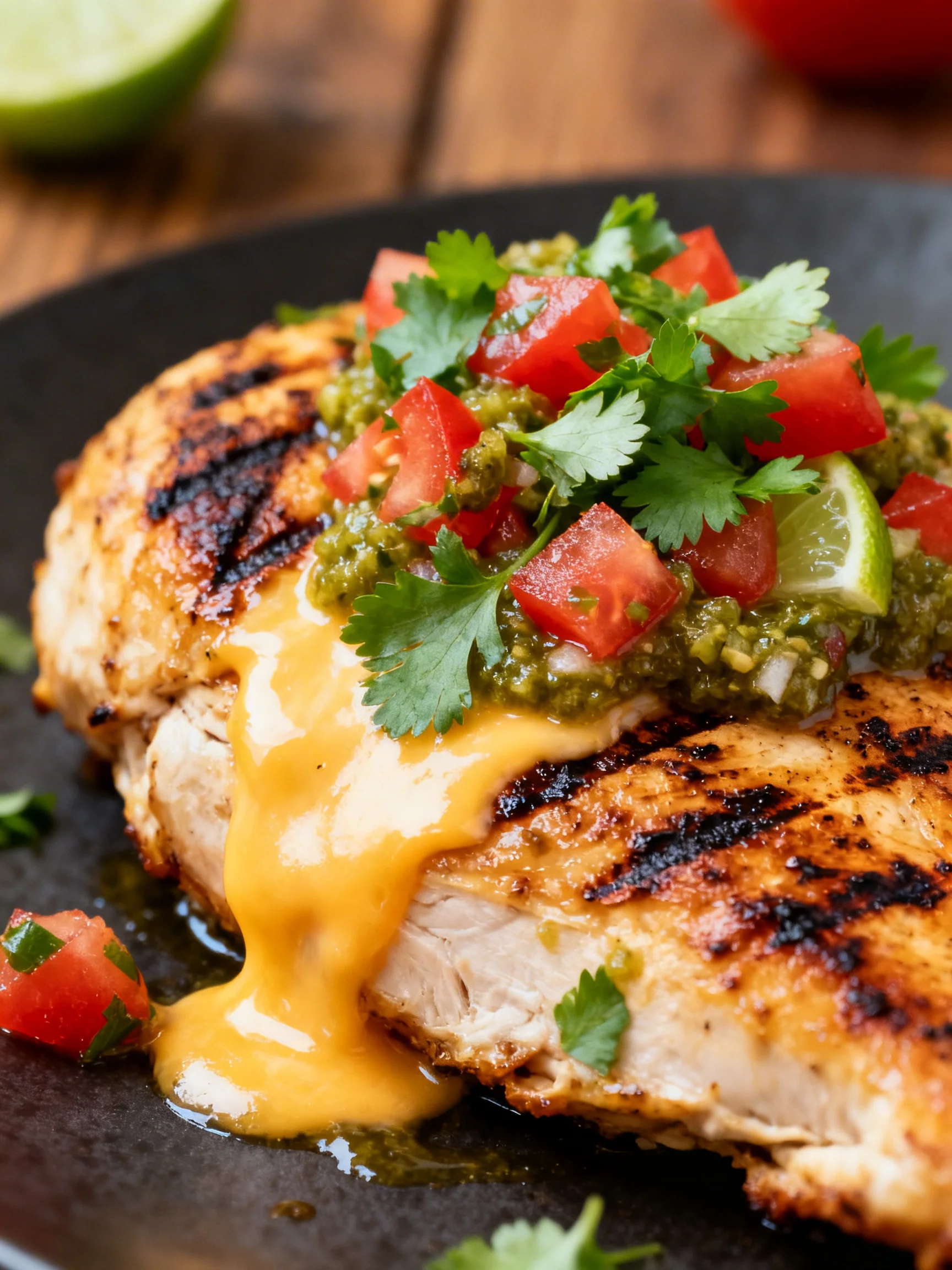 Transfer the grilled salsa verde pepper jack chicken to a clean plate and let it rest for 3-5 minutes. This allows the juices to redistribute. Garnish with fresh cilantro and serve with lime wedges on the side for an extra burst of freshness.
