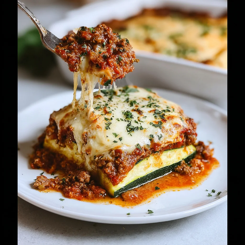 Reduce the oven temperature to 375°F (190°C). In a 9×13 inch baking dish, spread a thin layer of the meat sauce. Top with a single layer of roasted zucchini strips. Spread half of the ricotta mixture evenly over the zucchini, then sprinkle with a portion of the mozzarella. Repeat the layers: meat sauce, zucchini, cheese filling, mozzarella. Finish with a final layer of meat sauce and the remaining mozzarella.