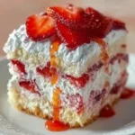 Carefully spread all of the creamy pudding mixture over the strawberry layer. Top with the remaining half of the torn angel food cake pieces, distributing them evenly. For an optional flavor boost, you can lightly drizzle the top cake layer with a teaspoon of fresh lemon juice to add a subtle brightness that cuts the sweetness.