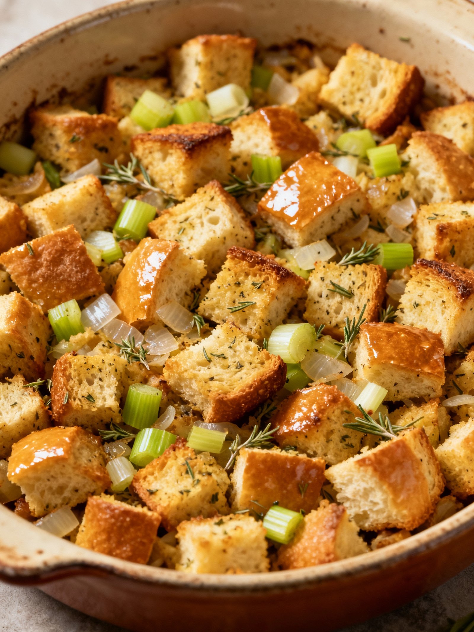 You can, but baking it separately in a dish is safer and more reliable. Cooking stuffing inside the turkey can lead to uneven cooking and food safety risks. Baking your Herb Bread Stuffing in its own pan ensures it cooks evenly and develops a deliciously crisp top.