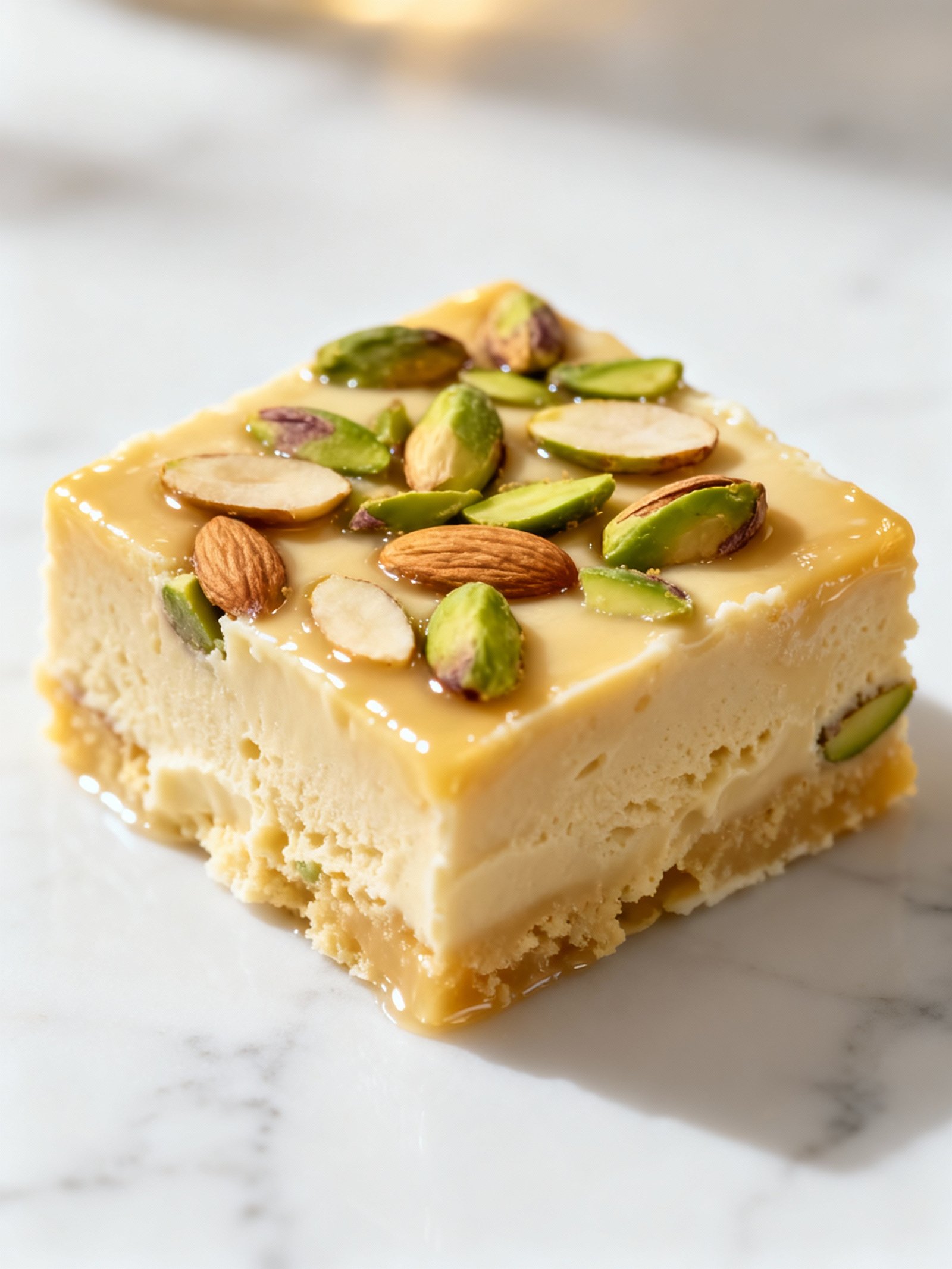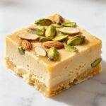 A soft and delicious Indian sweet made with milk powder, ghee, sugar syrup, and flavored with vanilla sugar, topped with nuts. This burfi has a silky smooth texture and a rich milky flavor.