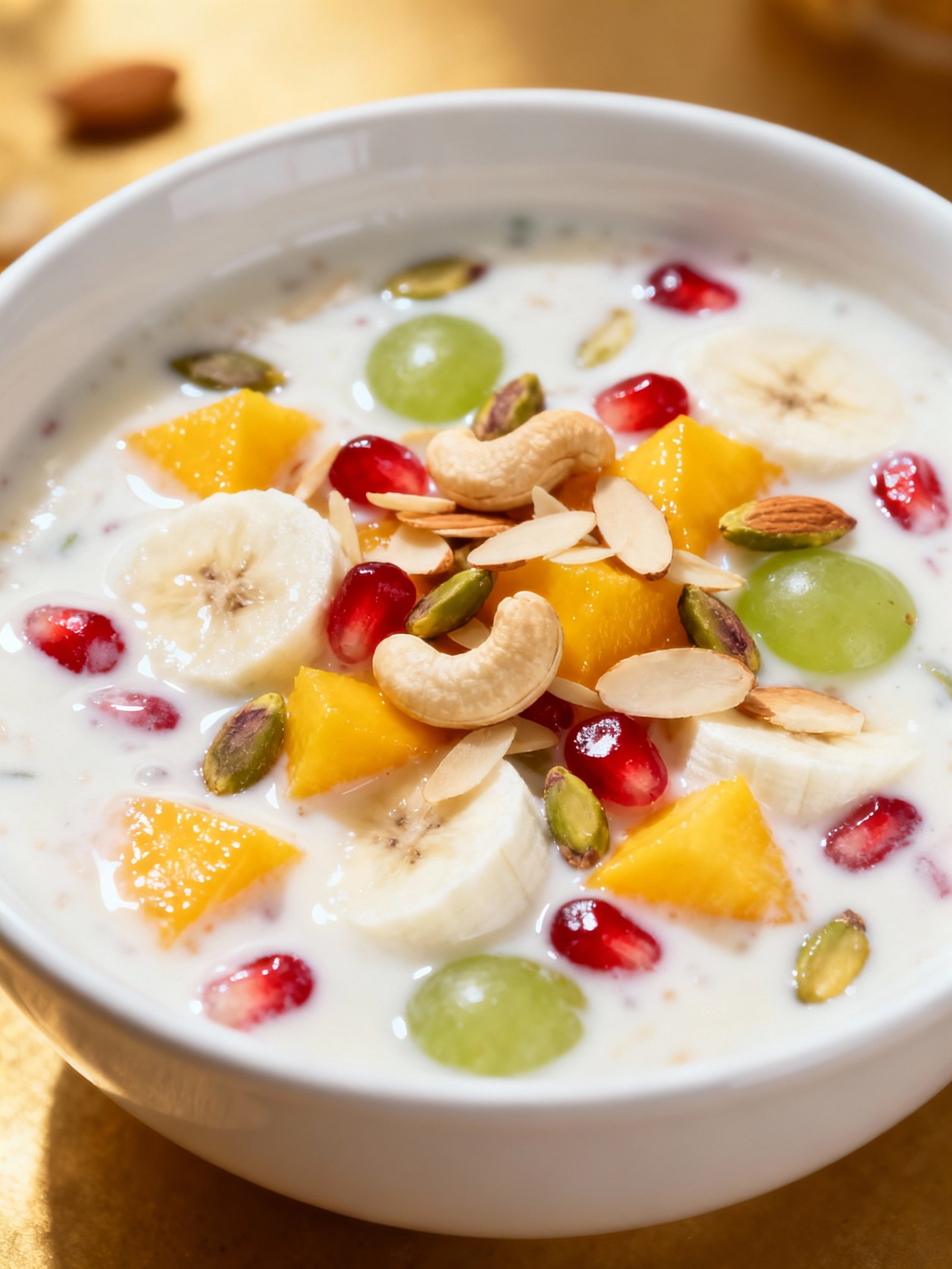 Use firm, sweet fruits like bananas, apples, mangoes, and pomegranate. Avoid watery fruits like watermelon to keep the rabdi creamy. This ensures your Instant Fruit Rabdi in Minutes! Custard Fruit Salad Recipe stays rich and delicious.