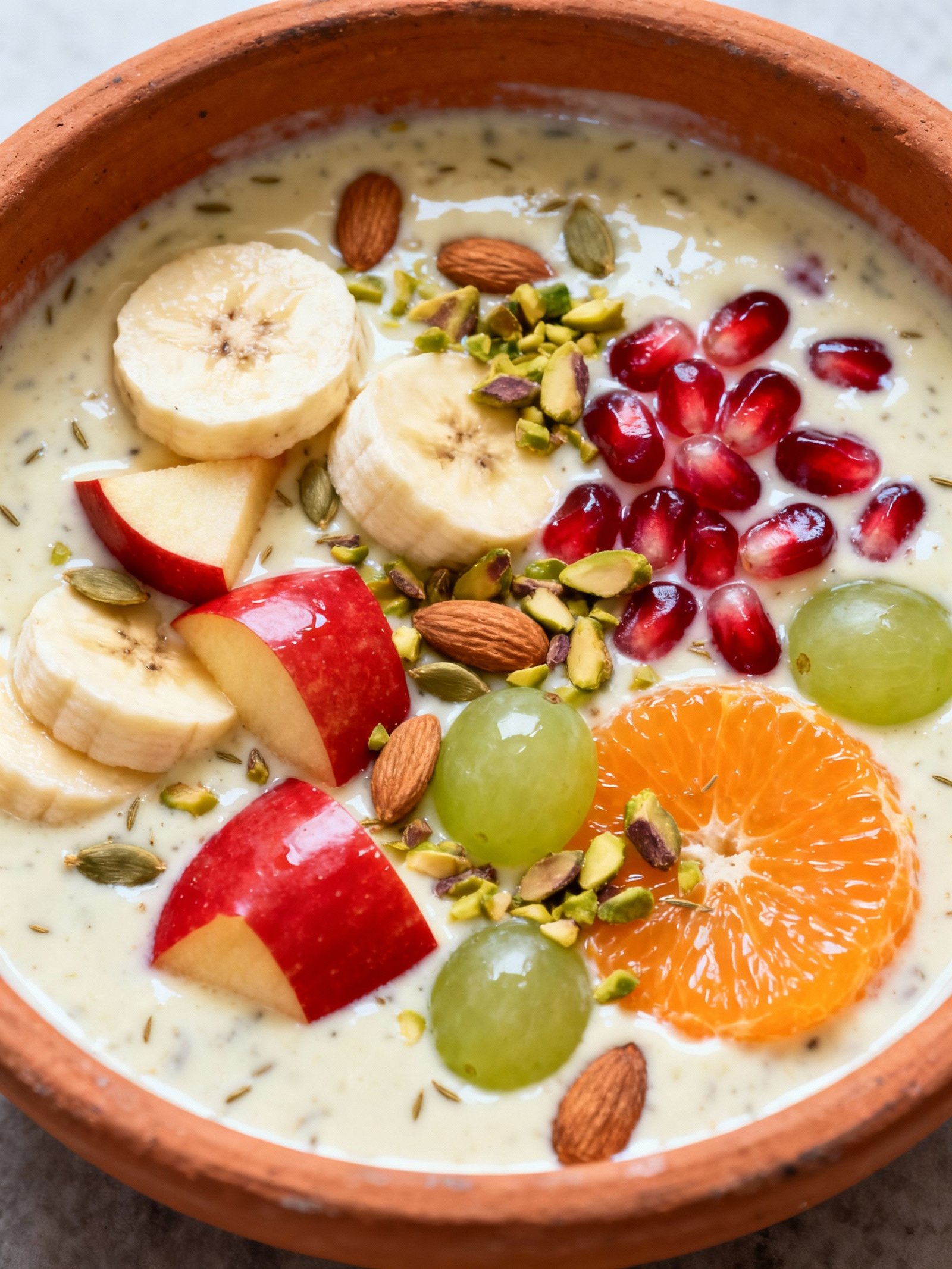 A quick and delicious Indian-inspired custard fruit salad that combines creamy rabdi-style custard with fresh mixed fruits for an instant, refreshing dessert.