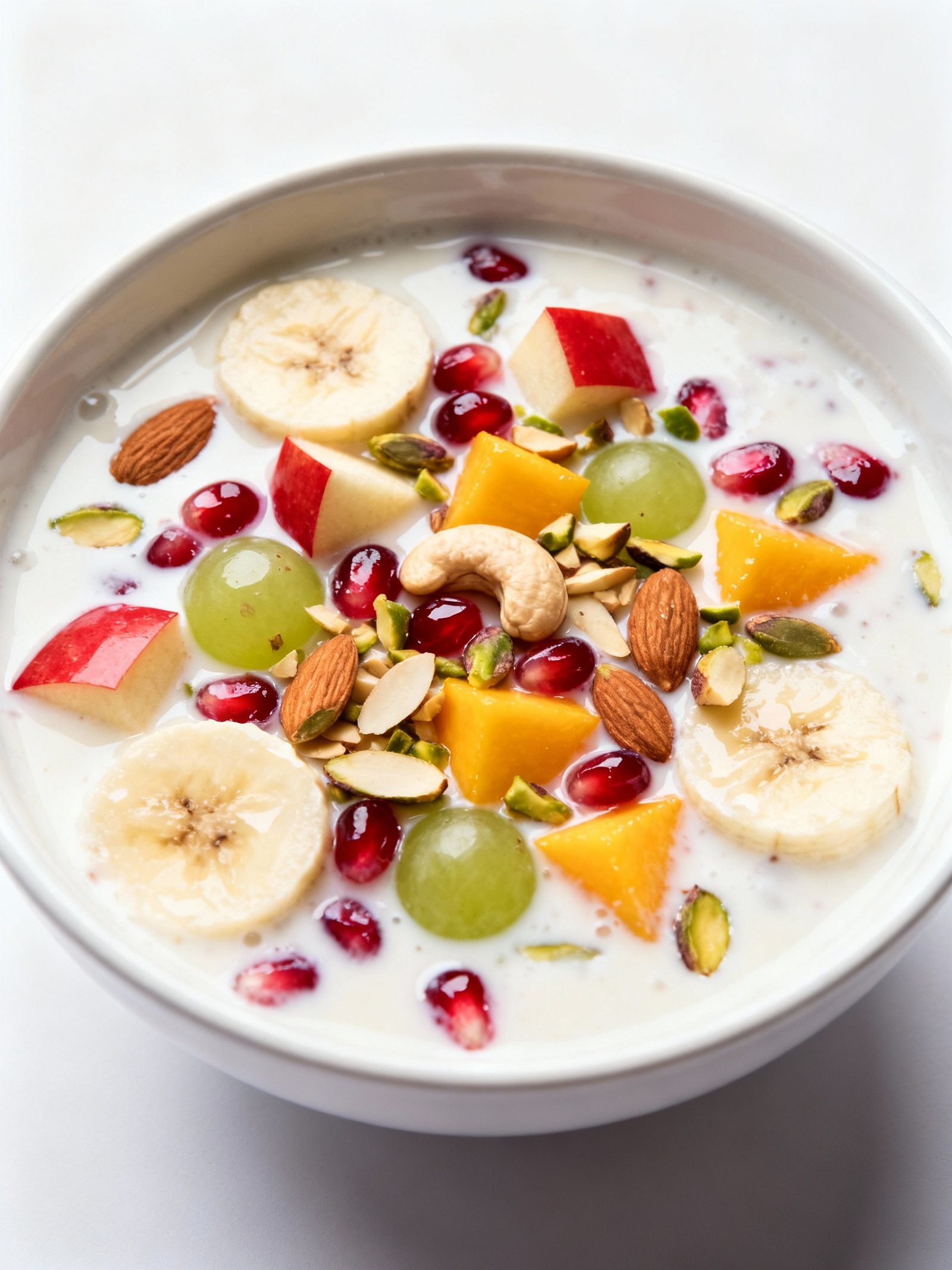 Use firm, non-watery fruits like apples, bananas, mangoes, and pomegranate. Avoid watery fruits like watermelon, as they can make the rabdi runny. Chop all fruits into small, uniform pieces for the best texture.