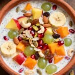 Wash and chop 2 cups of mixed seasonal fruits like bananas, apples, mangoes, and pomegranate seeds into bite-sized pieces. Keep them chilled to maintain freshness and texture.