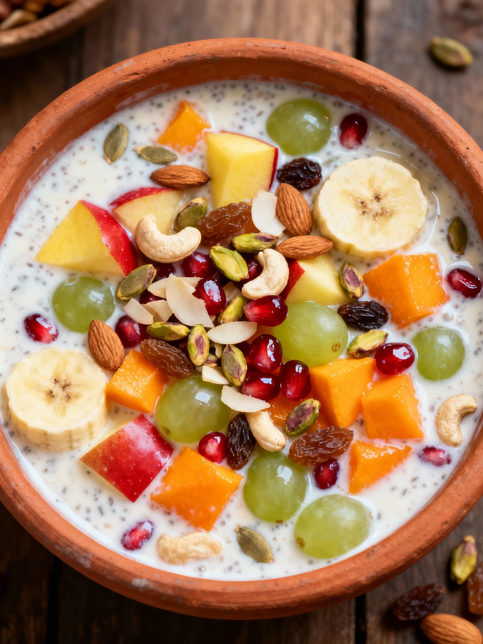 Use firm, sweet fruits like bananas, apples, mangoes, and grapes. Avoid watery fruits like watermelon to keep the rabdi thick. This ensures your Instant Fruit Rabdi in Minutes! Custard Fruit Salad Recipe stays creamy and delicious.