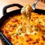 Spread the creamy filling evenly into a greased 9×13-inch baking dish. Top with 1 cup shredded mozzarella cheese and the remaining bacon crumbles. For extra crunch, sprinkle ¼ cup crushed pork rinds or almond flour over the top before baking.