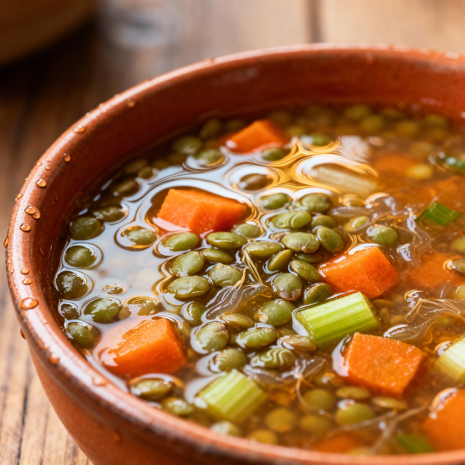 A hearty and comforting soup made with red or green lentils, onions, carrots, celery, and aromatic spices.