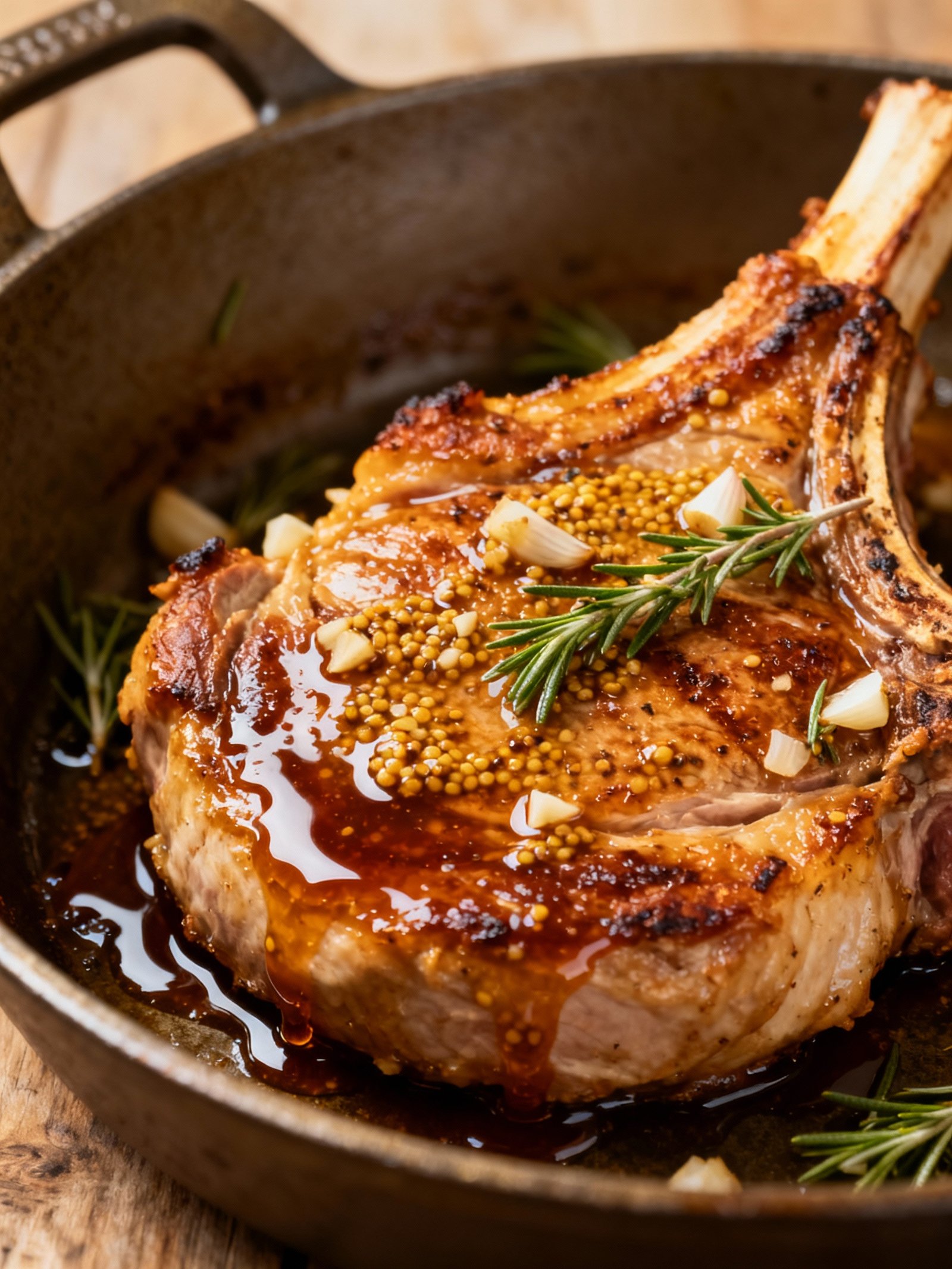 Tender pork chops with a caramelized crust and a perfect balance of sweet maple syrup and sharp Dijon mustard, enhanced with garlic and fresh thyme for full-bodied flavor.