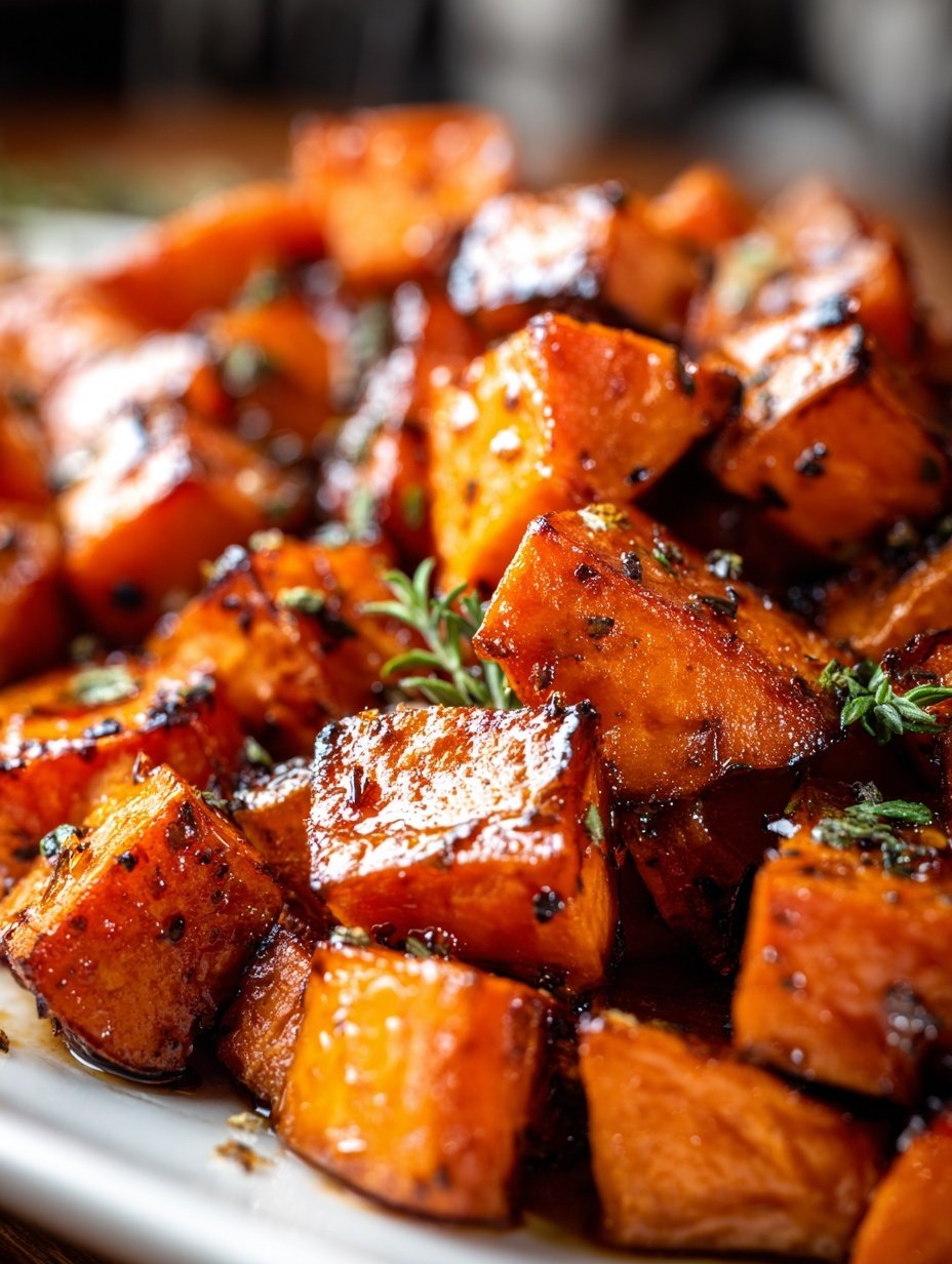 Caramelized and buttery roasted sweet potatoes glazed with maple syrup and Dijon mustard for a deliciously sweet and tangy flavor.
